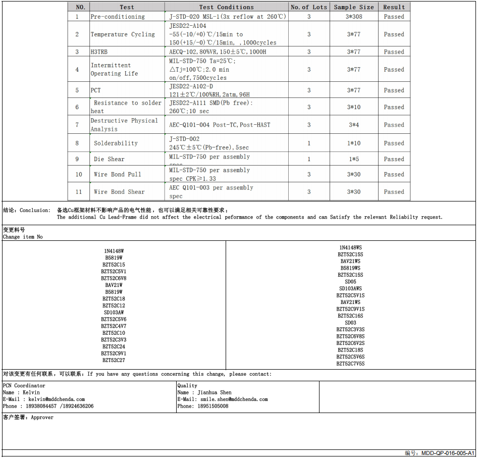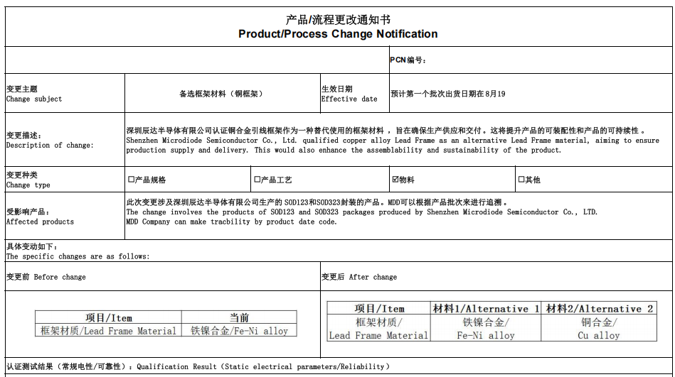 通知:MDD辰達(dá)半導(dǎo)體產(chǎn)品框架材質(zhì)更改通知書