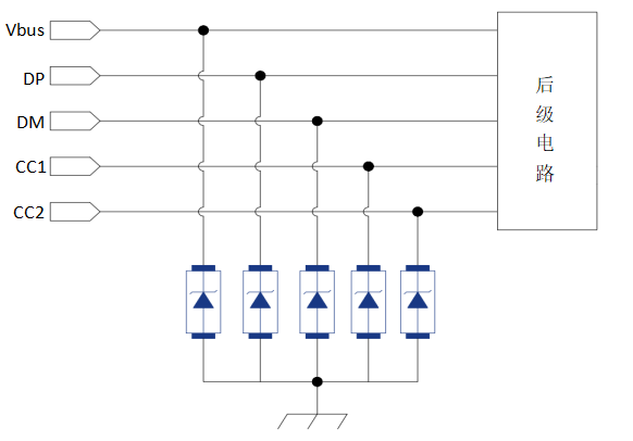 充電功率從5V/3A逐步提升至36V/5A,用于充電功能的關(guān)鍵線路(如USB-A中的Vbus、DP、DM,以及USB-C中的Vbus、DP、DM、CC1、CC2)成為防護(hù)的重點(diǎn)。EOS浪涌和ESD可能通過這些線路侵入后級(jí)電路,甚至因插拔操作產(chǎn)生的浪涌也可能導(dǎo)致主控芯片損壞。