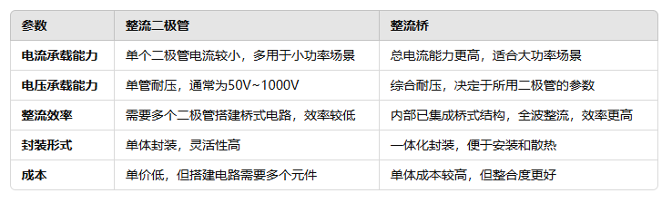如果電路的功率需求較?。?lt;1A),可以選擇單個(gè)整流二極管搭建整流電路;而在高功率場(chǎng)景下(>1A),整流橋更適合使用。