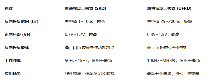 從上表可以看出,超快恢復(fù)二極管的反向恢復(fù)時(shí)間(trr)極短,可以顯著減少反向恢復(fù)損耗,使其在高頻開(kāi)關(guān)電源、PFC(功率因數(shù)校正)、逆變器等高效能電路中更具優(yōu)勢(shì)。而普通整流二極管因trr較長(zhǎng),適用于工頻整流等低速應(yīng)用。