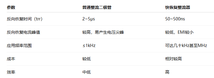 整流器件的一個關(guān)鍵性能指標就是反向恢復(fù)時間(trr),即當二極管從導(dǎo)通狀態(tài)轉(zhuǎn)入截止狀態(tài)所需的時間。普通硅整流管的trr通常在幾微秒(μs)級別,而快恢復(fù)整流器的trr一般控制在數(shù)百納秒(ns)以內(nèi),甚至更低。